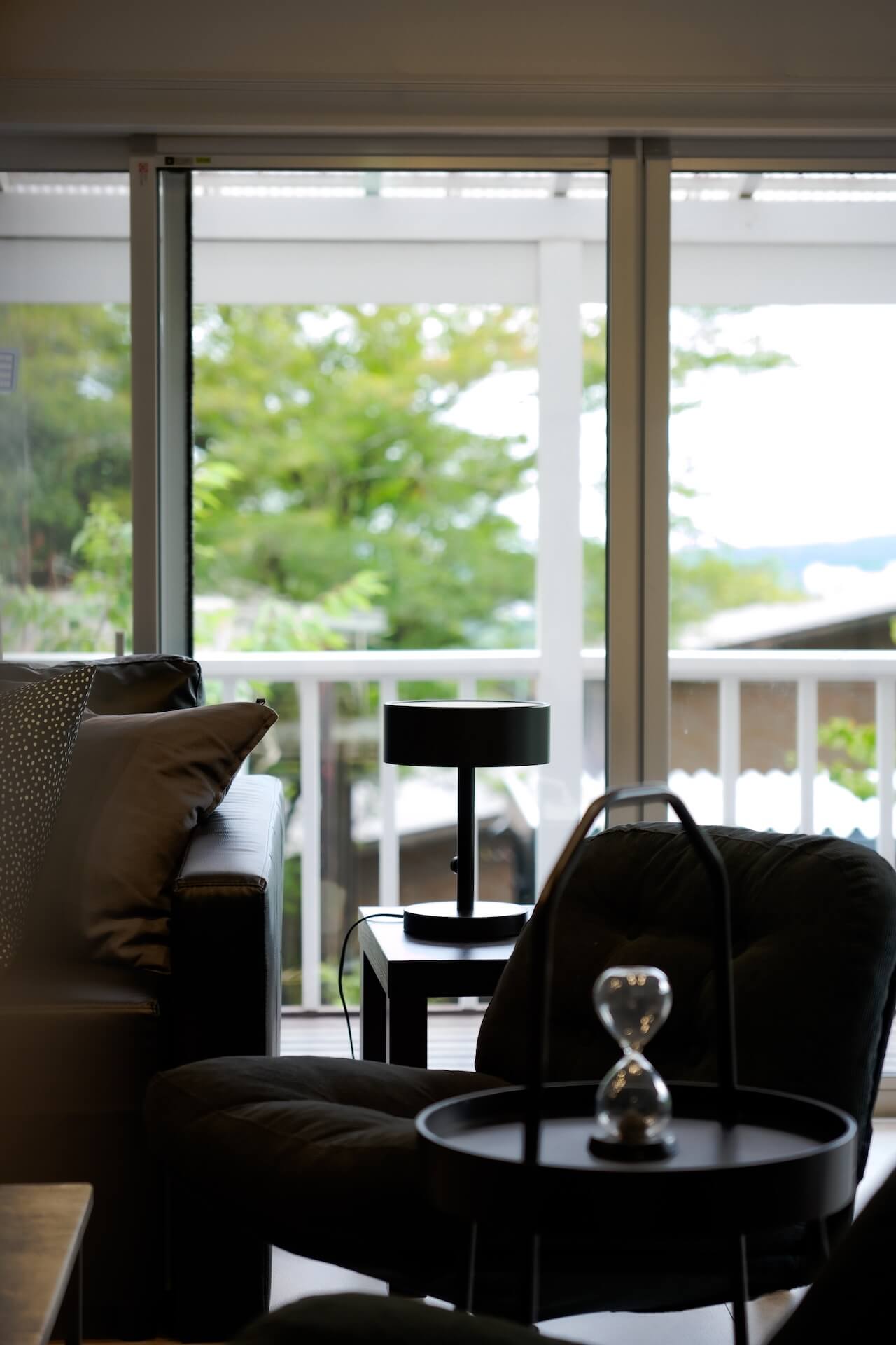 ソファに身を預ければ、窓の向こうには豊かな緑と空。